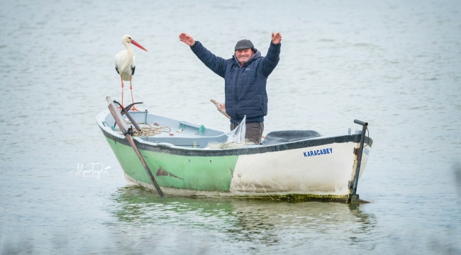 Bursa Karacabey'de, balıkçı Adem Yılmaz ile kurduğu dostluk hikâyesiyle milyonların gönlüne taht kuran Yaren Leylek, 12. yılda da göçten gelip Eskikaraağaç Leylek Köyü'ndeki dostu Yılmaz’ın kayığına kondu.