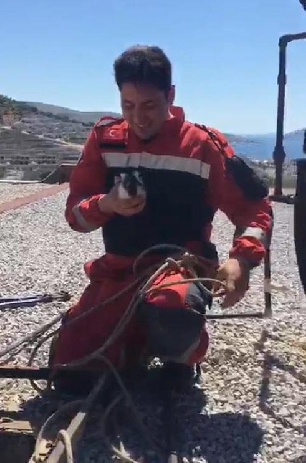 MUĞLA'nın Bodrum ilçesinde, havalandırma boşluğuna düşen yavru kediyi itfaiye ekipleri özel aparatlar yardımıyla kurtardı.