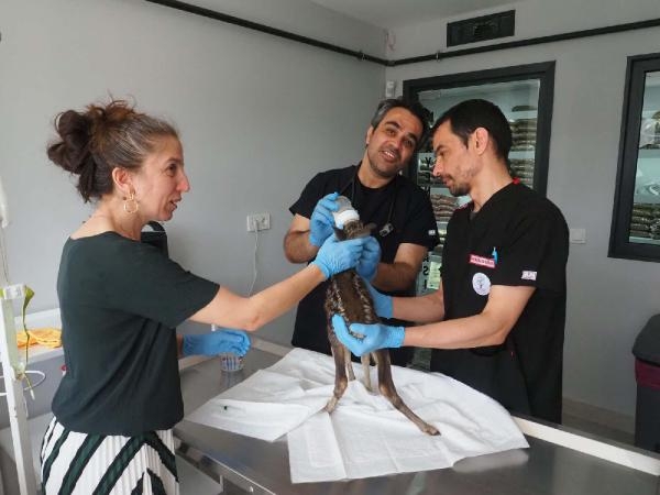 Yavru karacanın muayenesini yapan Veteriner Hekim Eda Ülkü Çınar, "Hayvanın iç, dış parazitlerini temizleyip vitaminlerini uyguladık" dedi. (DHA)