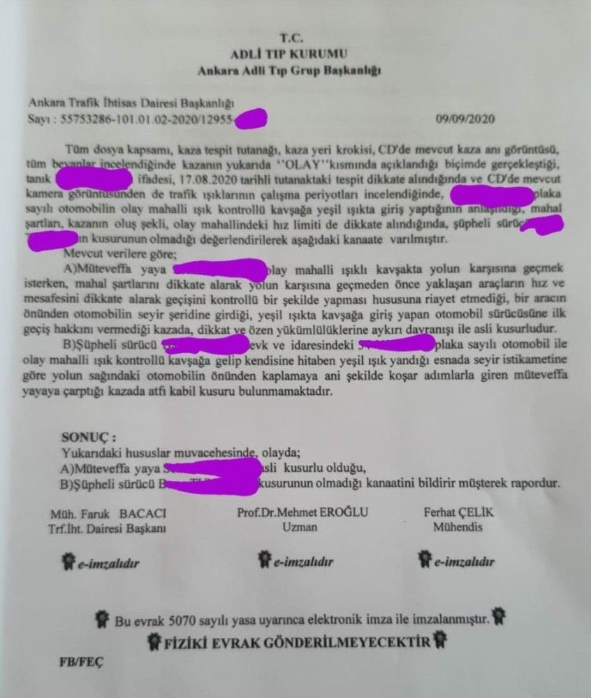 MOBESE kameralarına yansıyan kazanın ardından tutulan bilirkişi raporunda hem sürücüye hem de yaya kusur bulunurken dosya, Kastamonu Cumhuriyet Başsavcılığı tarafından Ankara Adli Tıp Kurumuna gönderildi. Ankara Adli Tıp Kurumu ise, hazırladığı raporunda, "CD'deki mevcut kamera görüntüsünden trafik ışıklarının çalışma periyotları incelendiğinde, 34 plakalı otomobilin olay mahalli ışık kontrollü kavşağa yeşil ışıkta giriş yaptığının anlaşıldığı, mahal şartları, kazanın oluş şekli, olay mahallindeki hız limiti de dikkate alındığında şüpheli sürücünün kusurunun olmadığı kanaatine varılmıştır" ifadelerine yer verildi. Tutulan rapor üzerine Kastamonu Cumhuriyet Başsavcılığı ise, kovuşturmaya yer olmadığına karar kılarak dosyayı kapattı.