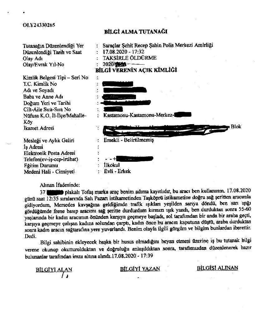 Açılan soruşturmada kazanın görgü tanıklarından K.K, Cumhuriyet Savcılığında verdiği ifadesinde, "Olay günü sağ şeritten aracımla seyir halindeydim. Kavşağa geldiğimde trafik ışıkları yeşilden sarıya döndü, ben sarı ışığı gördüğümde frene basıp aracımı sağ şeritte durdurdum ve kırmızı ışık yandı. Ben durduktan sonra 55-60 yaşlarında bir kadın aracımın önünden karşıya geçmeye başladı, sol tarafımdan bir anda bir araba geçti, karşıya geçmeye çalışan kadına çarptı. Kadın önce aracın kaputuna düştü, araba durduktan sonra kadın aracın önüne doğru yuvarlandı. Benim olayla ilgili bilgim ve gördüğüm bundan ibarettir" dedi.