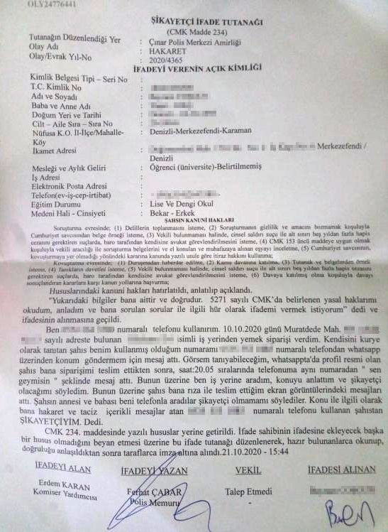 Yaşadığı olayın şokunu üzerinden atamayan genç, Denizli İl Emniyet Müdürlüğüne bağlı karakola giderek mesajları gönderen kuryeden ve işletmeden şikayetçi oldu.
