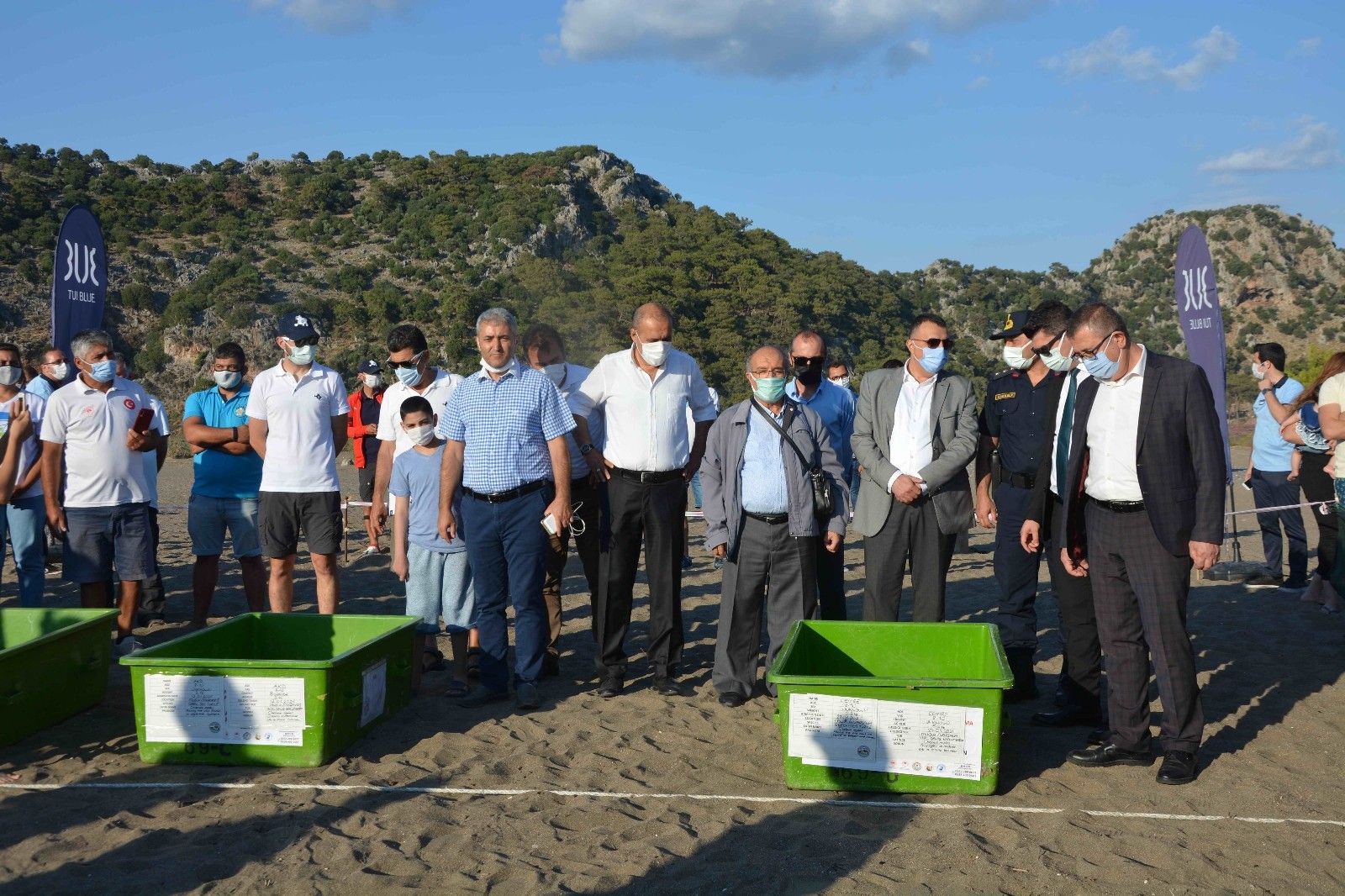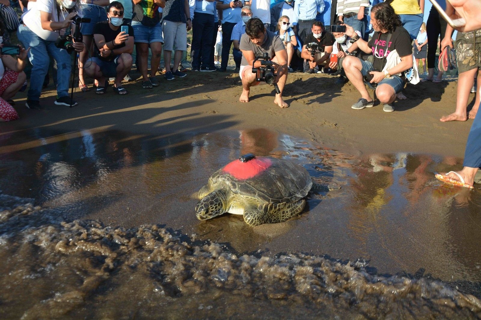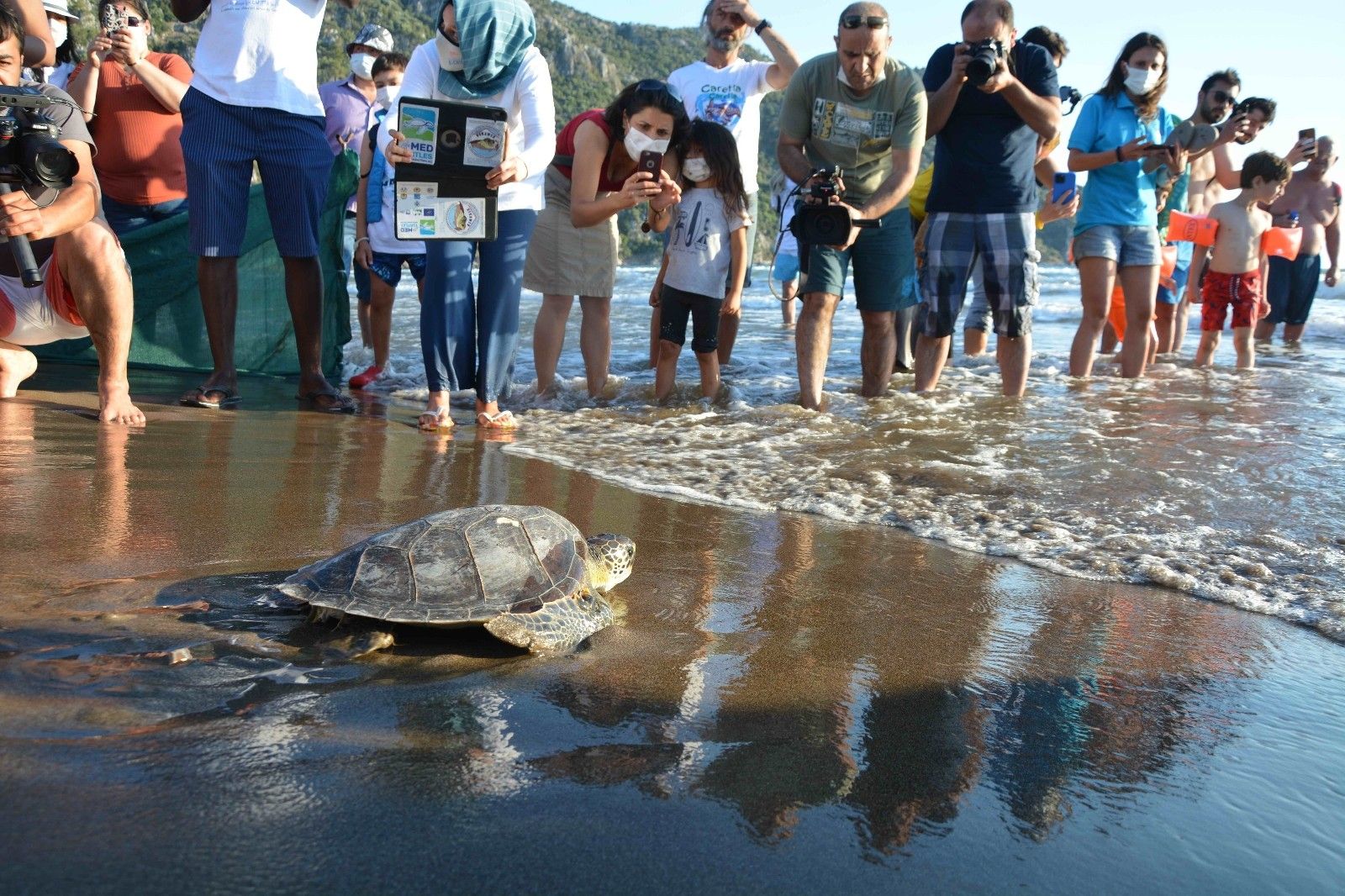 'Talay' ismi verilen yeşil deniz kaplumbağasına tören öncesi uydu takip cihazı takıldı. İztuzu kumsalından doğal yaşam ortamına bırakılan 'Talay' uydudan izlenebilecek.