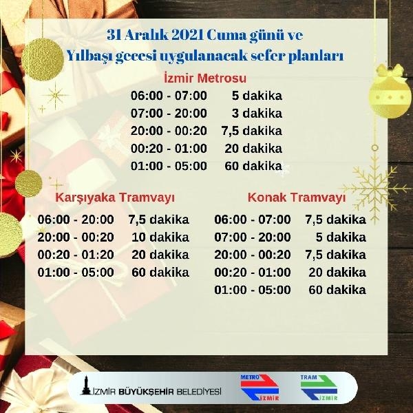 İzmir Büyükşehir Belediyesi'nin hizmet birimleri, yılbaşında da 24 saat görev yapacak. Kentlilerin her türlü su ve kanal arızası, ulaşım, zabıta ve benzeri belediye hizmetleriyle ilgili konularda şikayet ve taleplerini alarak, anında cevap verebilmek amacıyla tüm ekipler hizmetlerini aksatmadan sürdürecek. Yılbaşı gecesi her türlü şikayet ve talepler için Hemşehri İletişim Merkezi'nin (HİM) 444 40 35 numaralı hattı ile İZSU'ya ait 185 numaralı çağrı merkezi 7/24 hizmet verecek. İzmir Metrosu ile Konak ve Karşıyaka tramvayları, yılbaşı gecesi sabaha kadar sefer yapacak. 31 Aralık 2021 Cuma sabahı 06.00'da başlayan seferler 1 Ocak 2022 Cumartesi gece yarısına kadar kesintisiz devam edecek.