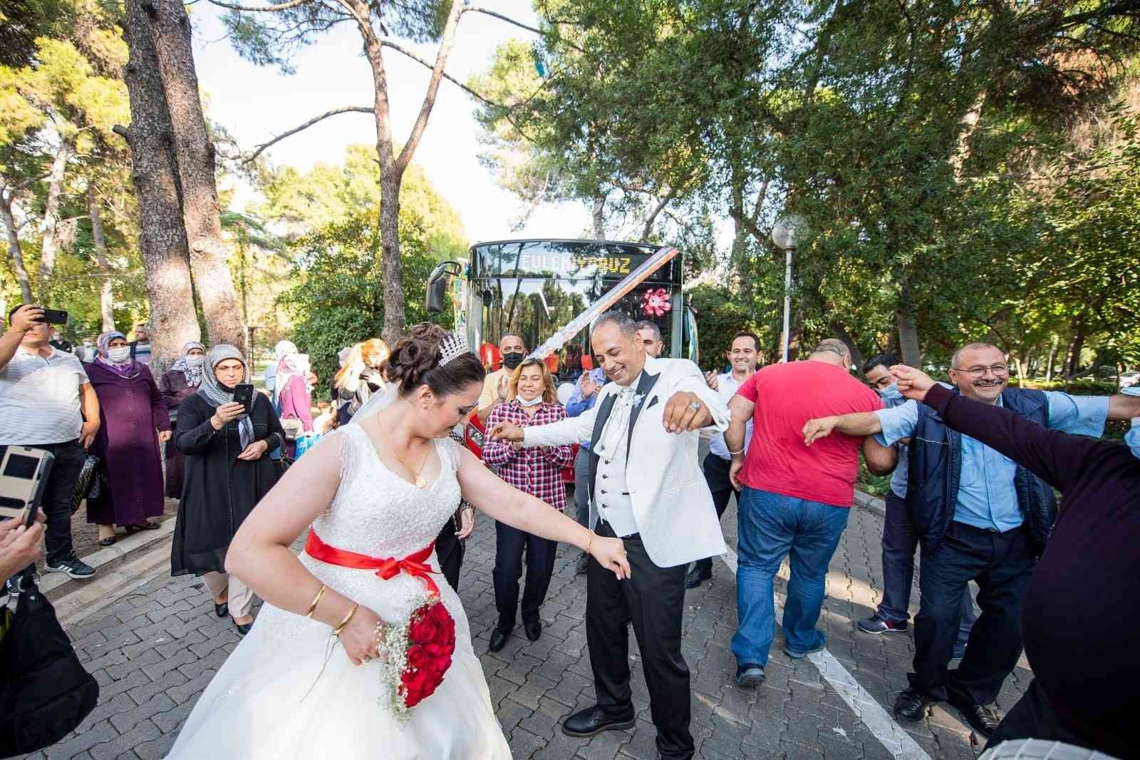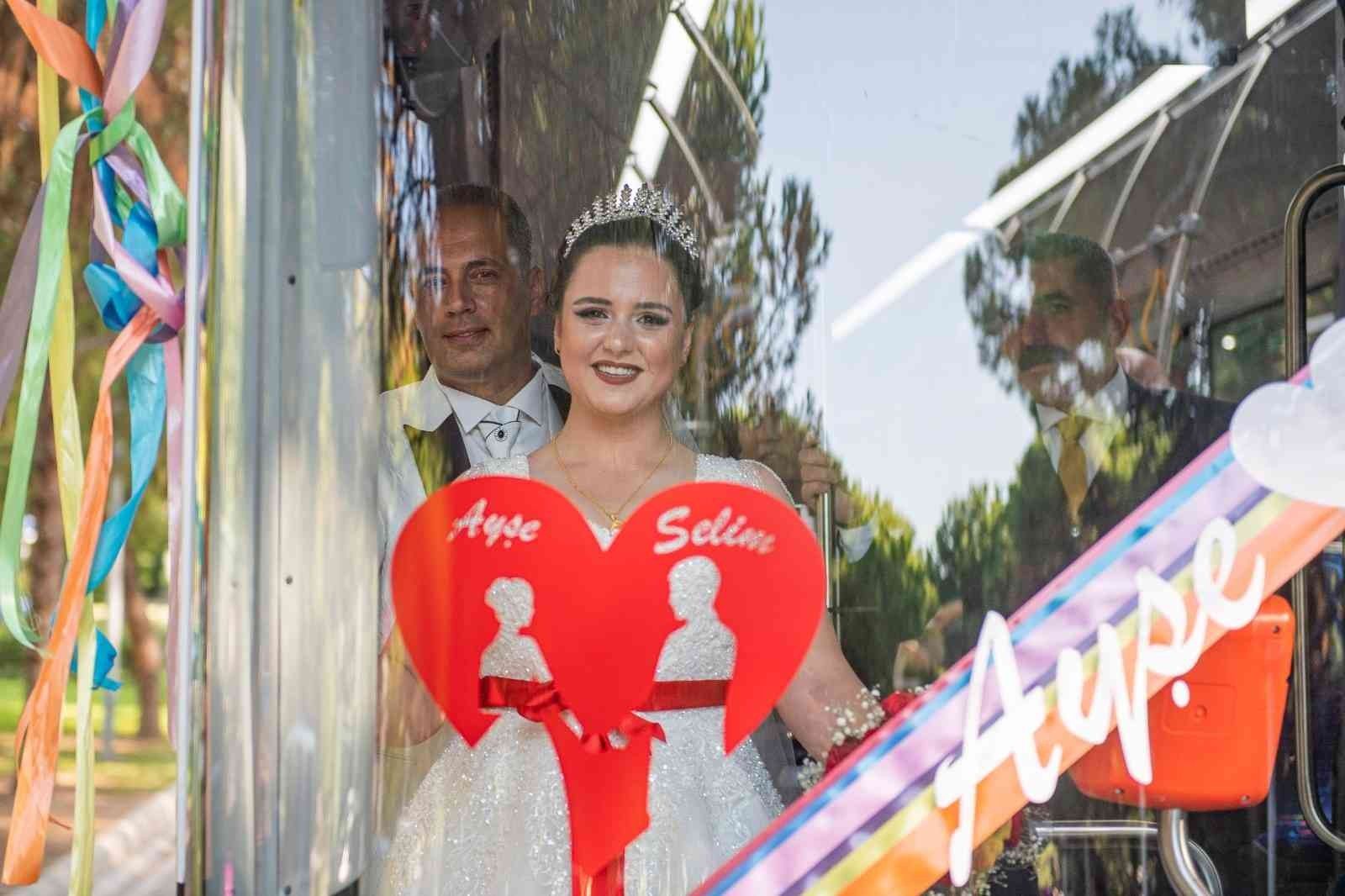 Meslektaşlarının, ESHOT Gediz Atölyesi'nde süslediği "gelin otobüsü", gelin Ayşe Akyol'u evinden aldı. Kısa bir şehir turunun ardından çiftin nikahı Kültürpark Evlendirme Dairesi'nde kıyıldı.