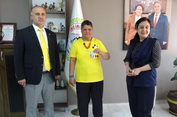 AYDIN'ın İncirliova ilçesinde zihinsel engelli Aslı Özakçakoca (31), yolda yürürken bulduğu içinde altın olan keseyi, sahibine ulaştırılması için belediyeye teslim etti. İncirliova Belediye Başkanı Aytekin Kaya, örnek davranışı nedeniyle Özakçakoca'ya bayramlık elbise ve ayakkabı hediye etti.