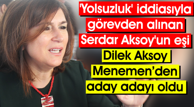 'Yolsuzluk ve zimmet' suçlamalarıyla İçişleri Balanlığı tarafından görevden alınan ve yargılanan Menemen Belediye Başkanı Serdar Aksoy'un eşi Dilek Aksoy, Menemen Belediyesi Başkan aday adaylığı için başvuru yapacağı öğrenildi.