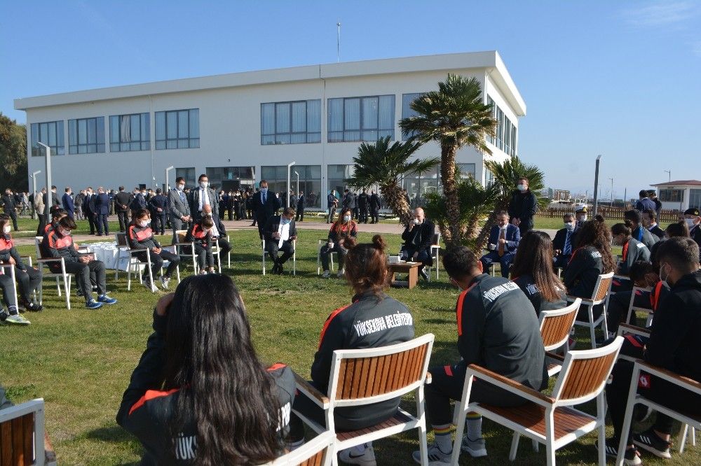 Balıkesir'in Ayvalık ilçesinde; Kadına Yönelik Şiddetle Mücadele Mülki İdare Amirleri Eğitim Semineri'ne katılan İçişleri Bakanı Süleyman Soylu, seminerin gerçekleştirildiği Vilayetler Hizmet Birliği bünyesindeki Vilayetler Evi'nde kamp yapan Hakkari'nin Yüksekova Belediyespor Kadın Futbol Takımı oyuncularını ziyaret etti.