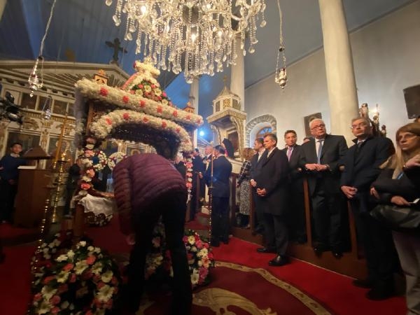 Ardından Gökçeada'yı Koruma, Yardımlaşma, Geliştirme ve Yaşatma Derneği'ni ziyaret eden Bakan Dendias, Tepeköy'de Agridia Kilisesi'ndeki Fener Rum Patriği I. Bartholomeos yönettiği Paskalya Yortusu ayinine katıldı.