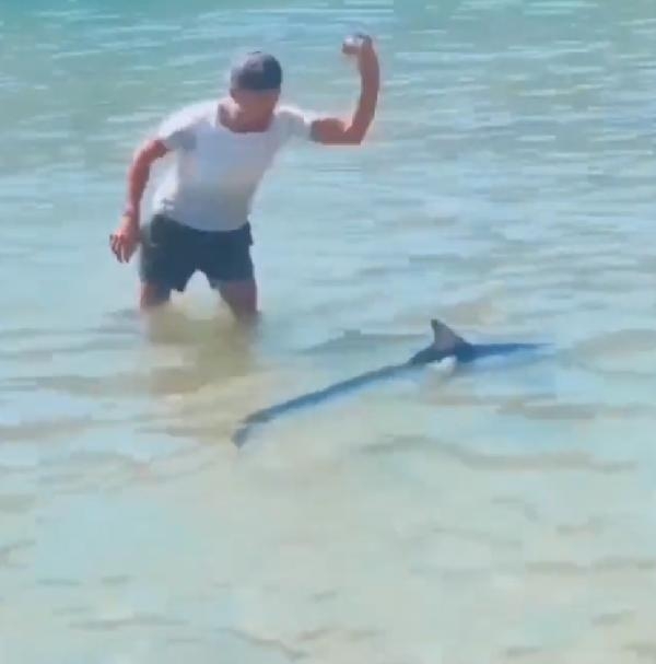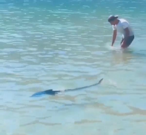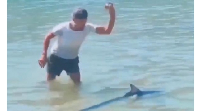 Görüntülerde elinde olta ile balığın yanına gelen bir kişi, balığın kafasına tokat attıktan sonra peşinden giderek kuyruğundan yakaladı. O kişinin balığı daha sonra kıyıya çıkarttığı öğrenildi.