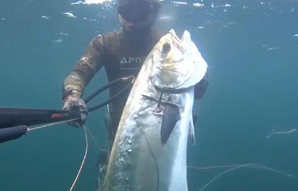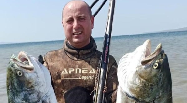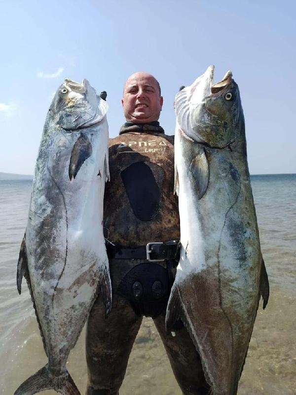 Çanakkale'de tüpsüz olarak zıpkınla dalış yapan Çetin Ege Doğan (43) ve Fatih Yerli (42), Saros Körfezi açıklarında yaklaşık 30 kilo ağırlığında ve 1,5 metre boyunda 2 liça balığı avladı.